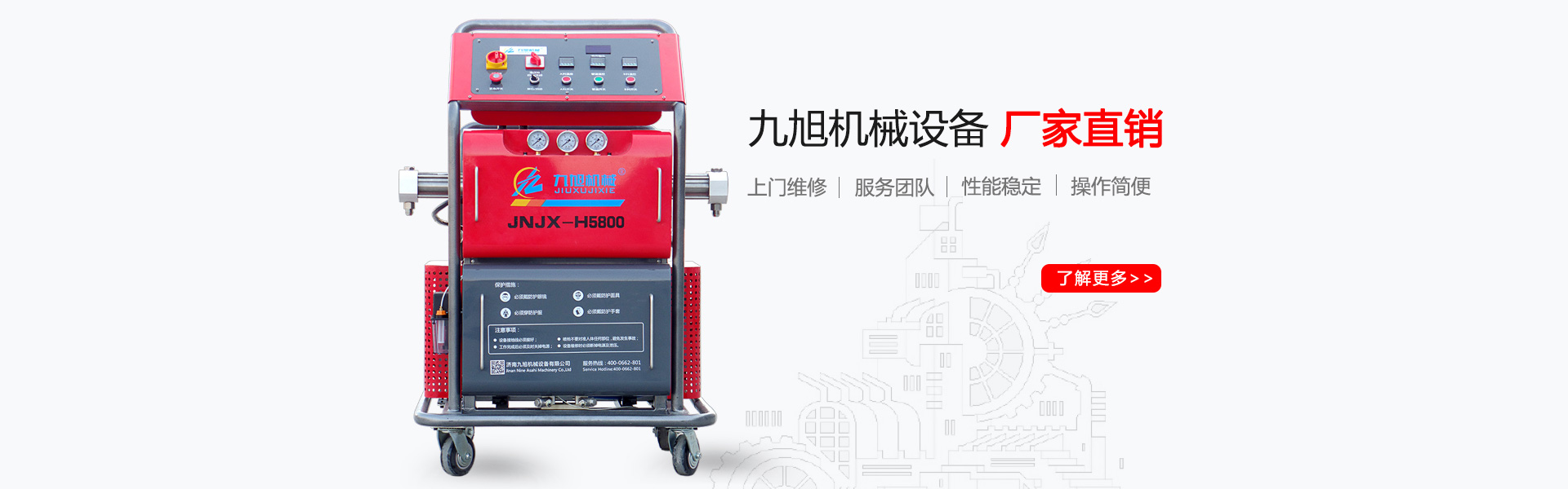 山東九旭機械科技有限公司歷經(jīng)十幾年的發(fā)展,已成長為聚氨酯設(shè)備行業(yè)頗具實力的設(shè)備制造廠家之一。企業(yè)主要產(chǎn)品:聚氨酯噴涂機、聚氨酯發(fā)泡機、聚氨酯澆注機、聚脲噴涂機等,關(guān)于設(shè)備配件(聚氨酯高壓噴槍、槍嘴、加熱管道、料塊、摩擦副、增壓泵、混合式、提料泵等)也是堅持最好的質(zhì)量服務(wù)用戶,并承接:外墻保溫、冷庫保溫發(fā)泡等工程...
